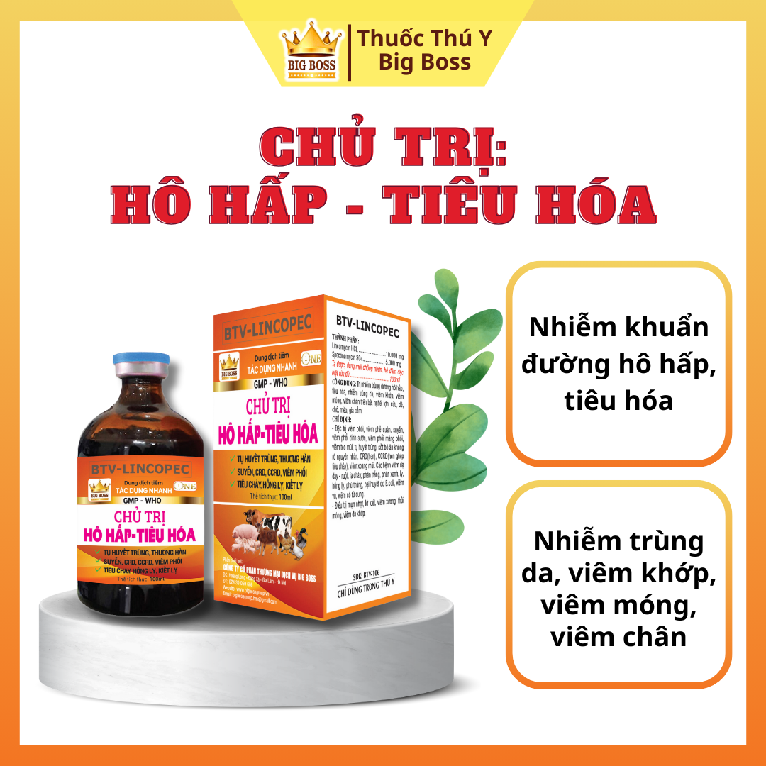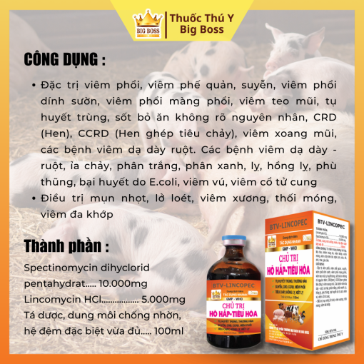 – Đặc trị viêm phổi, viêm phế quản, suyễn, viêm phổi dính sườn, viêm phổi màng phổi, viêm teo mũi, tụ huyết trùng, sốt bỏ ăn không rõ nguyên nhân, CRD (Hen), CCRD (Hen ghép tiêu chảy), viêm xoang mũi, các bệnh viêm dạ dày ruột. Các bệnh viêm dạ dày – ruột, ỉa chảy, phân trắng, phân xanh, lỵ, hồng lỵ, phù thũng, bại huyết do E.coli, viêm vú, viêm cổ tử cung