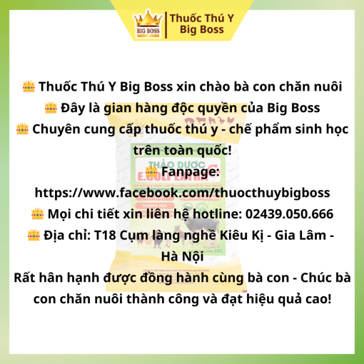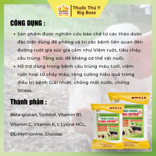 Sản phẩm được nghiên cứu bào chế từ các thảo dược đặc biệt dùng để phòng và trị các bệnh liên quan đến đường ruột gia súc gia cầm như Viêm ruột, tiêu chảy, cầu trùng. Tăng sức đề kháng cơ thể vật nuôi.