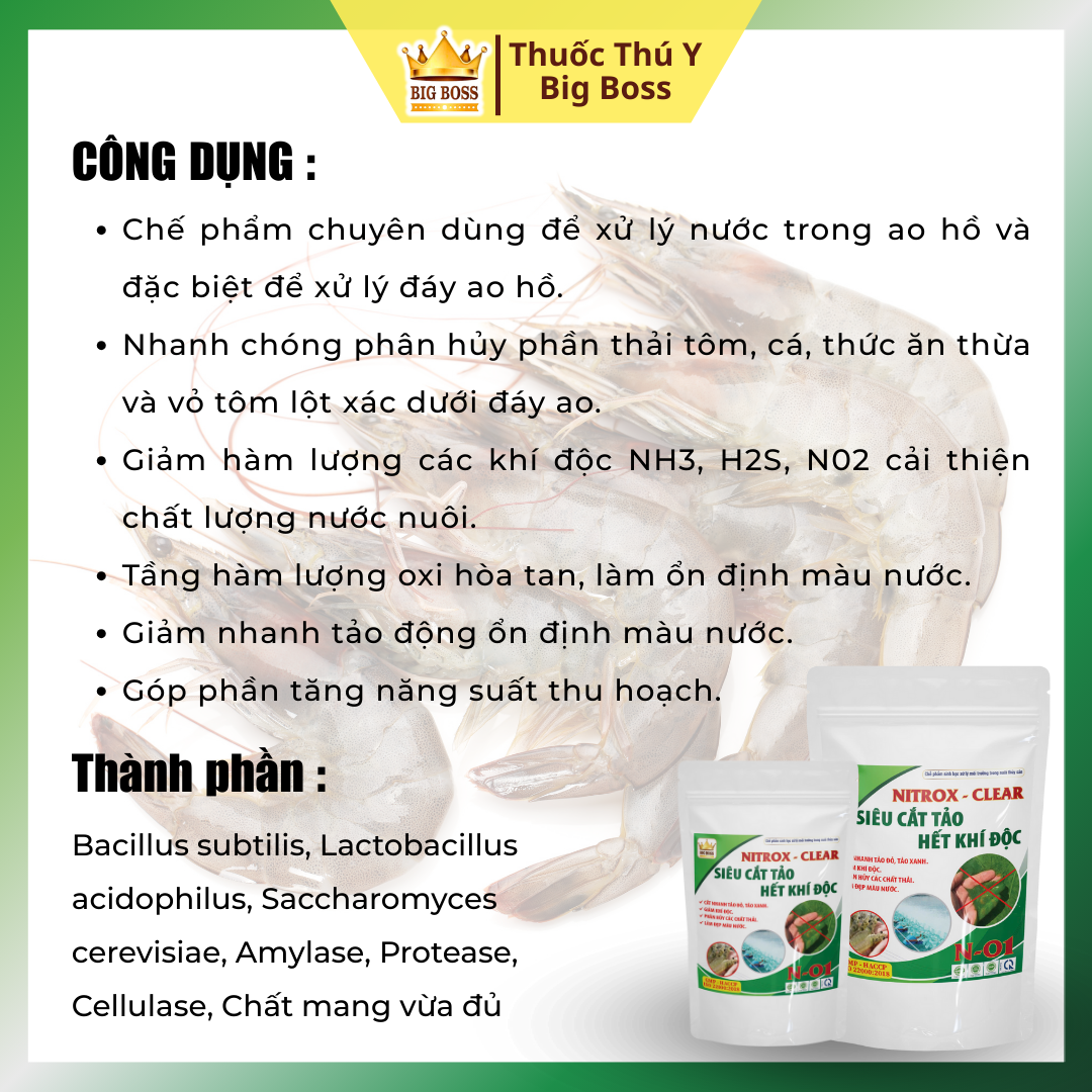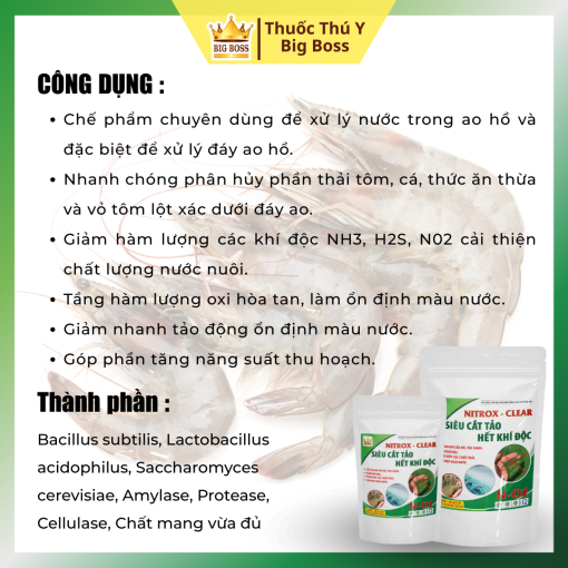 – Nhanh chóng phân hủy phần thải Tôm, Cá, thức ăn thừa và vỏ Tôm lột xác dưới đáy ao.