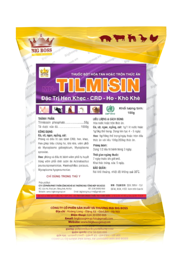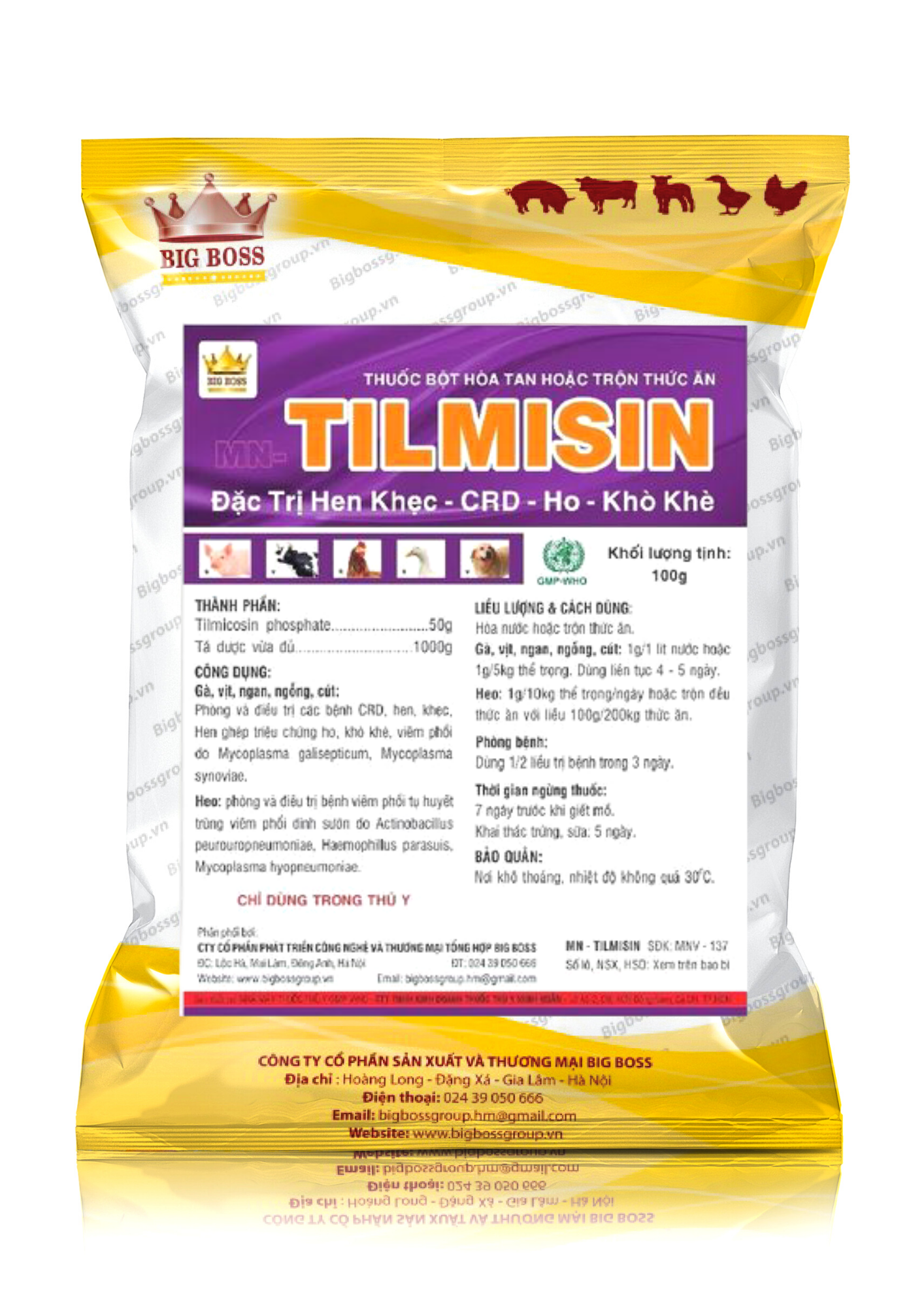Timisin 5% Gà, vịt, ngan, ngỗng, cút : Phòng, và điều trị các bệnh CRD, hen, khẹc, Hen ghép triệu chứng ho, khò khè, viêm phổi do Mycoplasmagalisepticum.Mycoplasma synoviae.
